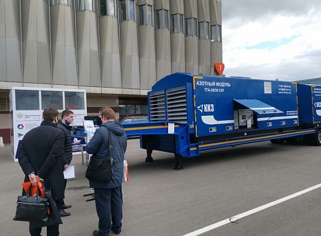 Также в рамках выставки ООО «НСК» на открытой выставочной экспозиции площадью 60 кв.м. продемонстрировали передвижную азотную компрессорную станцию на полуприцепе общим размером 16 метров в длину и 2,5 метра в ширину. Станция размещается на грузовом шасси и предназначена для производства азота из атмосферного воздуха под давлением 351 атмосфер с производительностью 20 м3 азота в минуту.