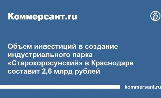 Объем инвестиций в создание индустриального парка «Старокоросунский» в Краснодаре составит 2,6 млрд рублей